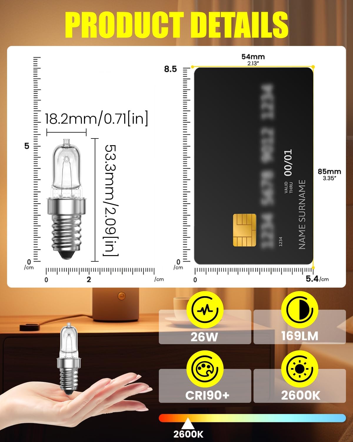Met een vermogen van 26 watt en warm wit licht van 2700K zorgt deze lamp voor een prettige, sfeervolle verlichting. Het warme licht maakt het eenvoudiger om gerechten goed te beoordelen tijdens het bakken en geeft tegelijkertijd een comfortabele uitstraling. De lamp is dimbaar en werkt op AC 220–240V met een E14-fitting.