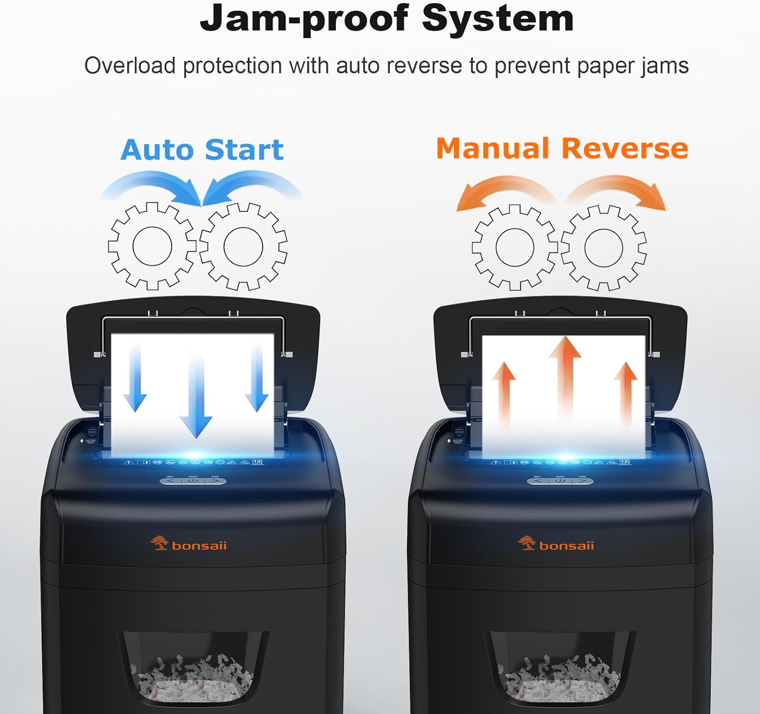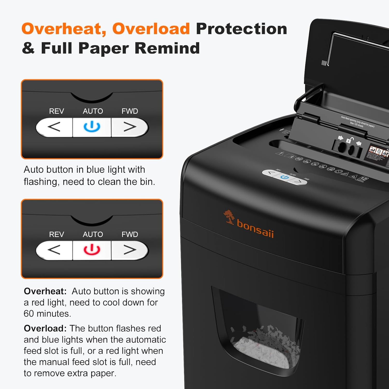 In de handmatige modus vernietigt de shredder zonder moeite creditcards, nietjes en paperclips. Dankzij de oververhittings- en overbelastingsbeveiliging gaat de machine langer mee en blijft hij betrouwbaar presteren.