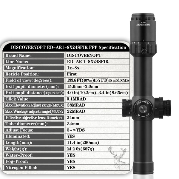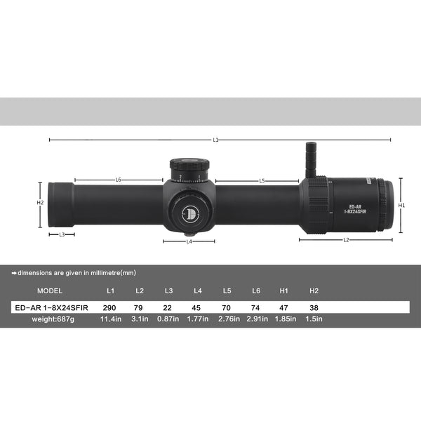 De ED-AR 1-8x24 is ontworpen voor schutters die snelheid en flexibiliteit nodig hebben. Dankzij het FFP dradenkruis blijft je richtpunt altijd schaalvast, ongeacht de vergroting. De 1x stand geeft een breed, natuurlijk beeld voor snelle doelacquisitie, terwijl 8x vergroting voldoende precisie biedt voor middellange afstanden. De 24 mm lens levert een helder en scherp beeld, ondersteund door een duurzame 34 mm buis die zorgt voor een stevige constructie en een ruim verstelbereik.