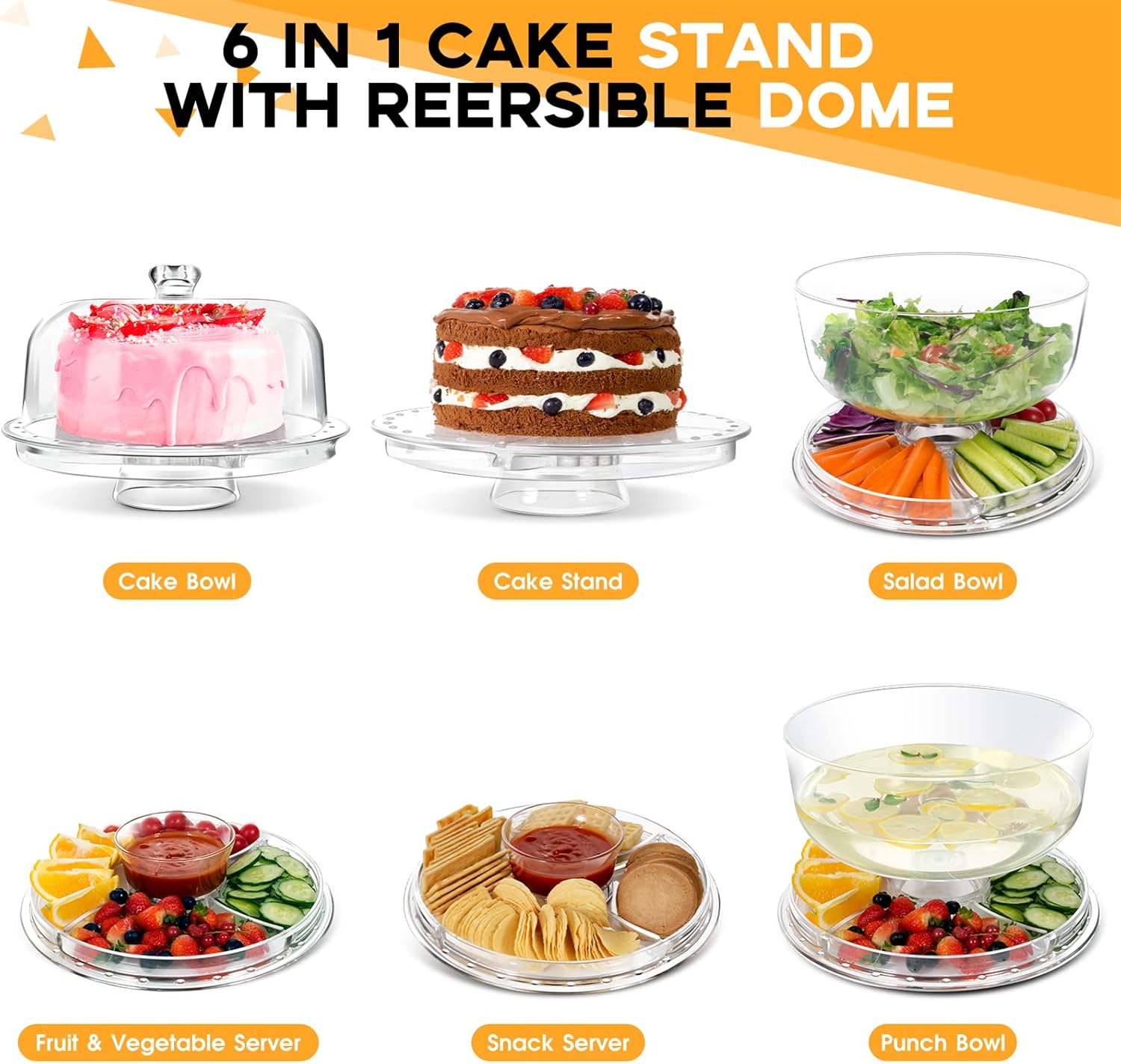 Deze multifunctionele 6-in-1 cake stand met transparante dome deksel is een slimme oplossing voor elke keuken of feesttafel. Gebruik hem als taartplateau, serveerschaal, saladeschaal, snacktray of dipschaal – simpelweg omdraaien en klaar. Ideaal voor verjaardagen, bruiloften, diners en dagelijks gebruik.