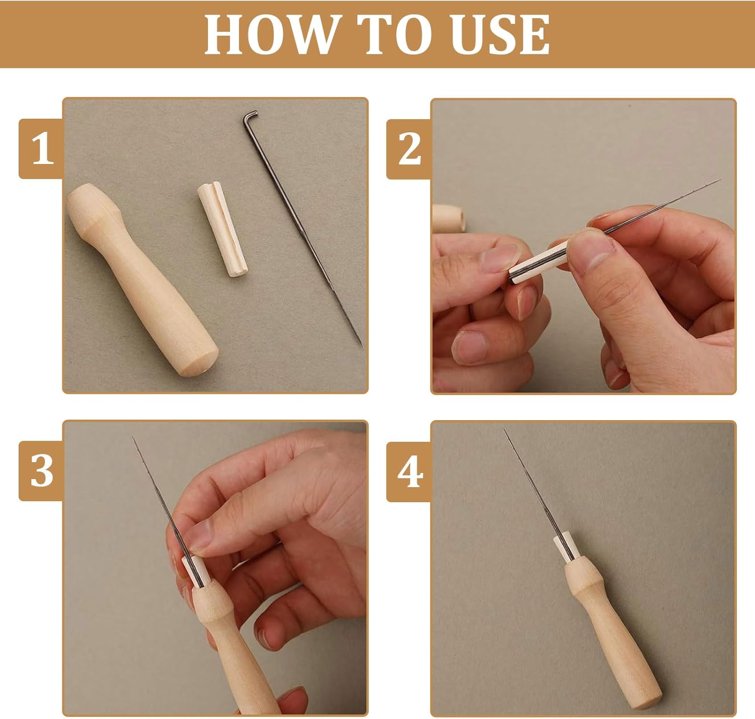 De set bevat drie houten handgrepen die prettig in de hand liggen. Eén houder is geschikt voor meerdere naalden tegelijk, ideaal voor sneller werken, en twee houders zijn bedoeld voor precisiewerk met één naald. Het wisselen van naalden is eenvoudig: losdraaien, naald plaatsen, vastdraaien en door.