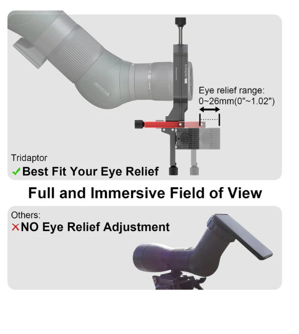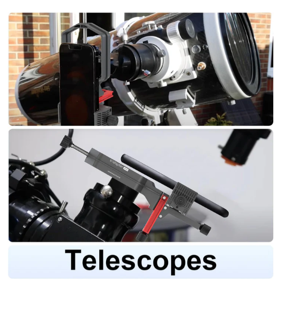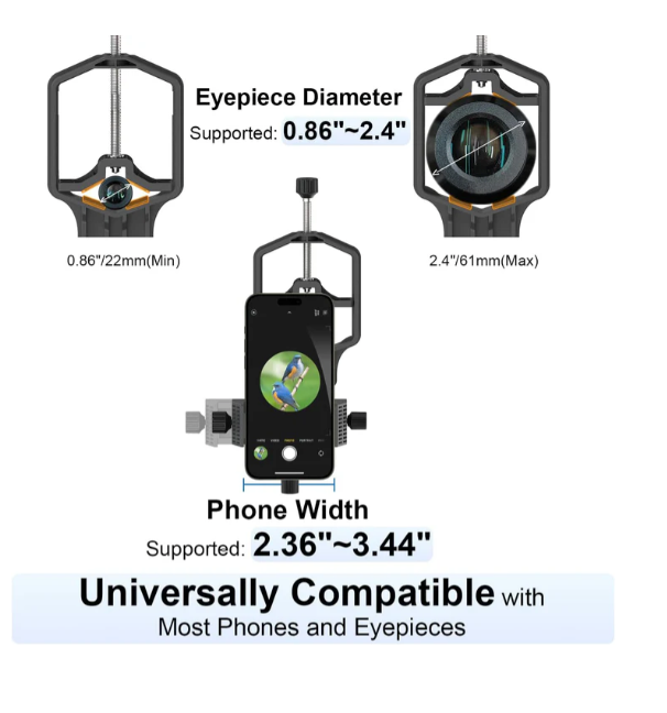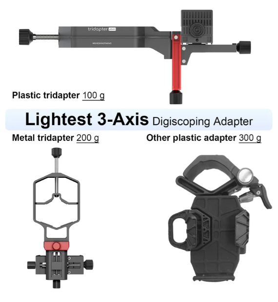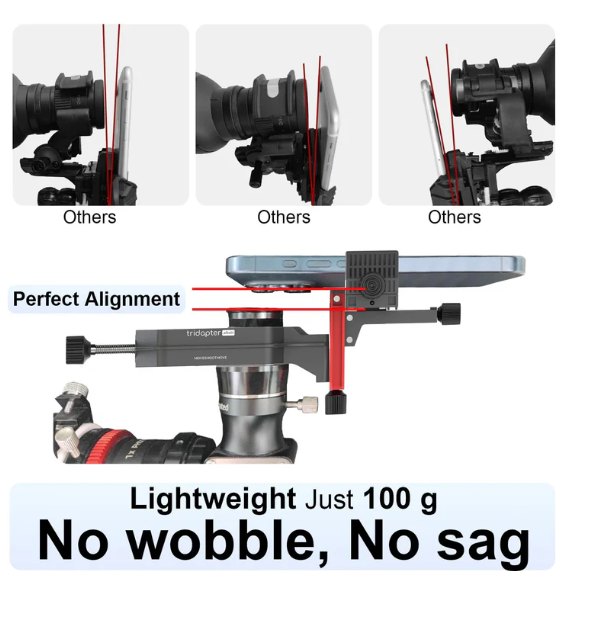 Deze ultralichte 3-assige adapter is speciaal ontwikkeld voor iedereen die moeiteloos wil digiscopen met smartphone en telescoop. Met slechts 101 gram is dit de lichtste 3-axis phone mount op de markt – ideaal voor stabiel en trillingsvrij beeld. Minder gewicht = meer controle.