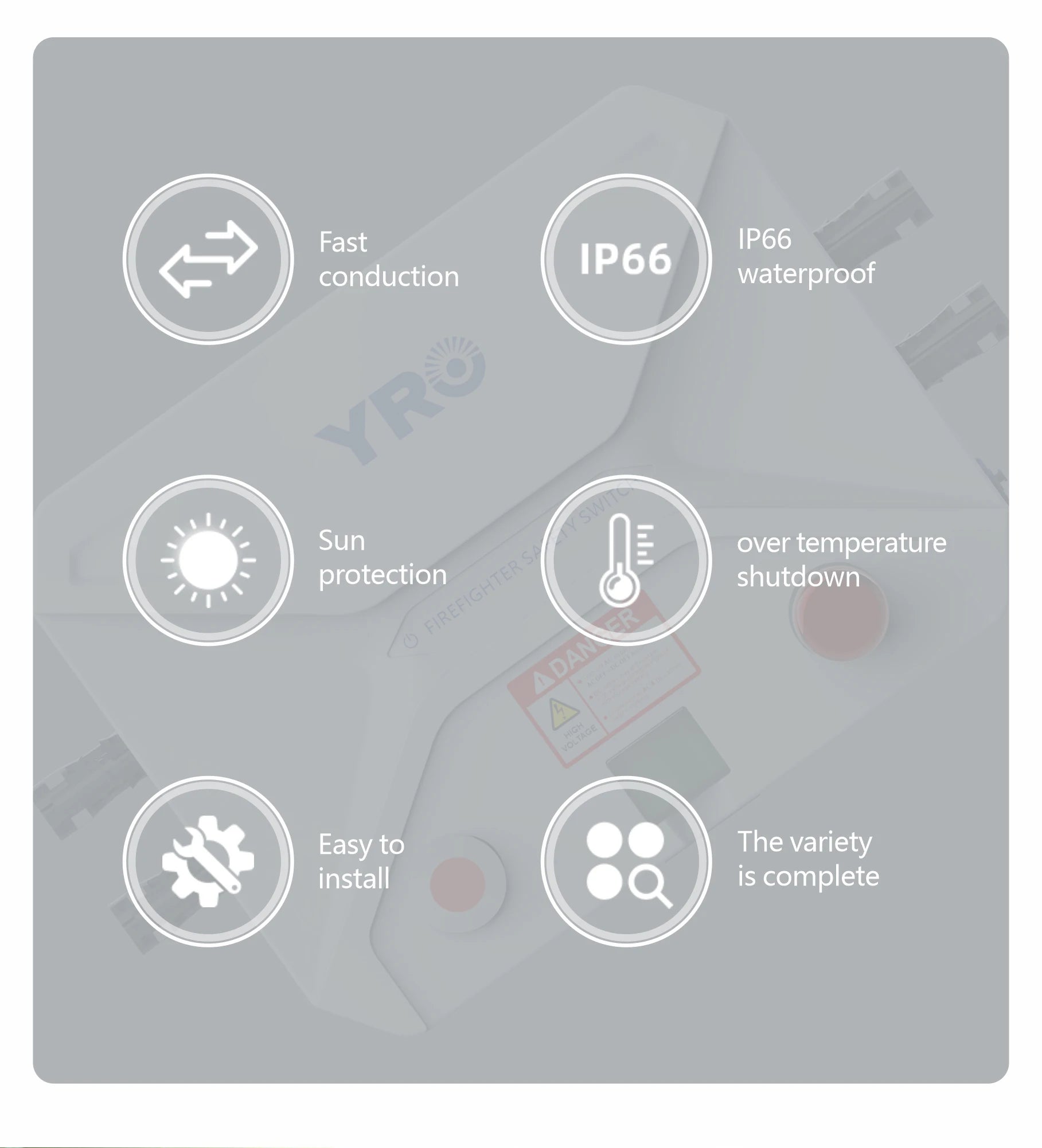 De YRO veiligheidsschakelaar uit de YRS / YRSD-A serie is een DC-ontkoppelingsoplossing voor brandbeveiliging van zonne-energiesystemen op daken en voldoet aan NEC 2014 en IEC/EN 60947-3.